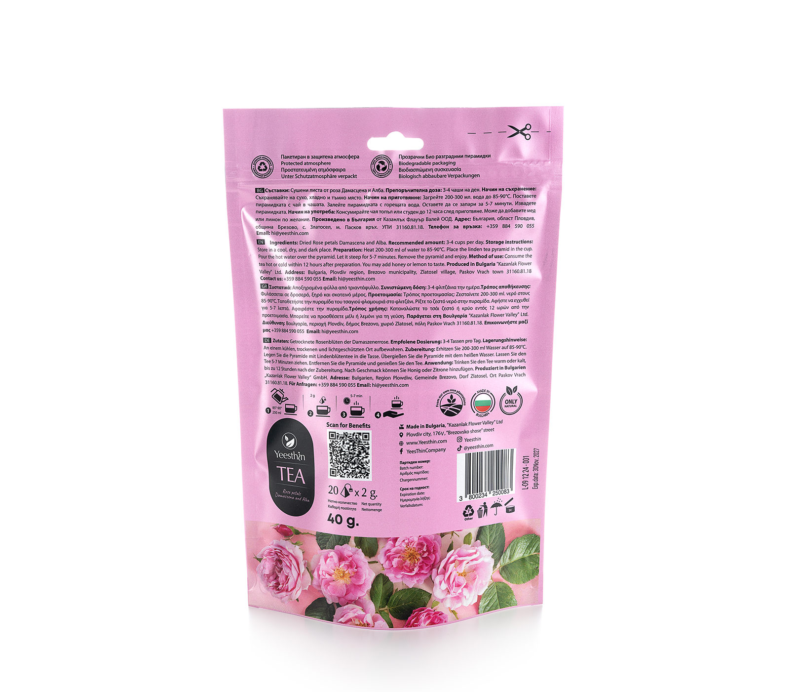 Το τσάι από τριαντάφυλλο Δαμασκηνής και Alba είναι ένα προϊόν υψηλής ποιότητας, παρασκευασμένο από προσεκτικά επιλεγμένα πέταλα τριαντάφυλλου. Τα άνθη καλλιεργούνται σε οικολογικά καθαρές περιοχές της Βουλγαρίας και αποξηραίνονται σε χαμηλές θερμοκρασίες, ώστε να διατηρούν το φυσικό τους άρωμα και τα πολύτιμα φυτικά τους χαρακτηριστικά.