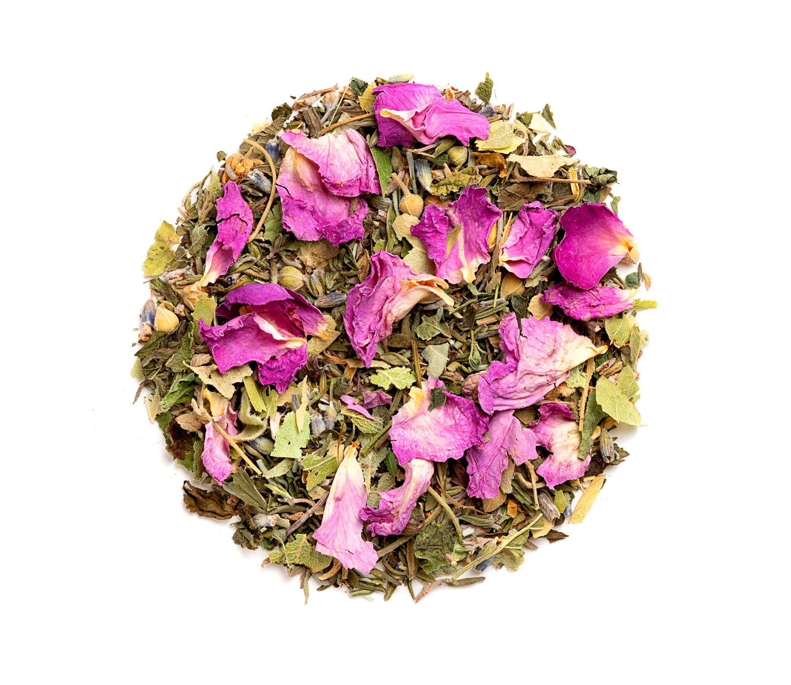 Αποξηραμένα άνθη τριαντάφυλλου Δαμασκηνής, μελισσόχορτο, θυμάρι, λεβάντα και φλαμουριά.
