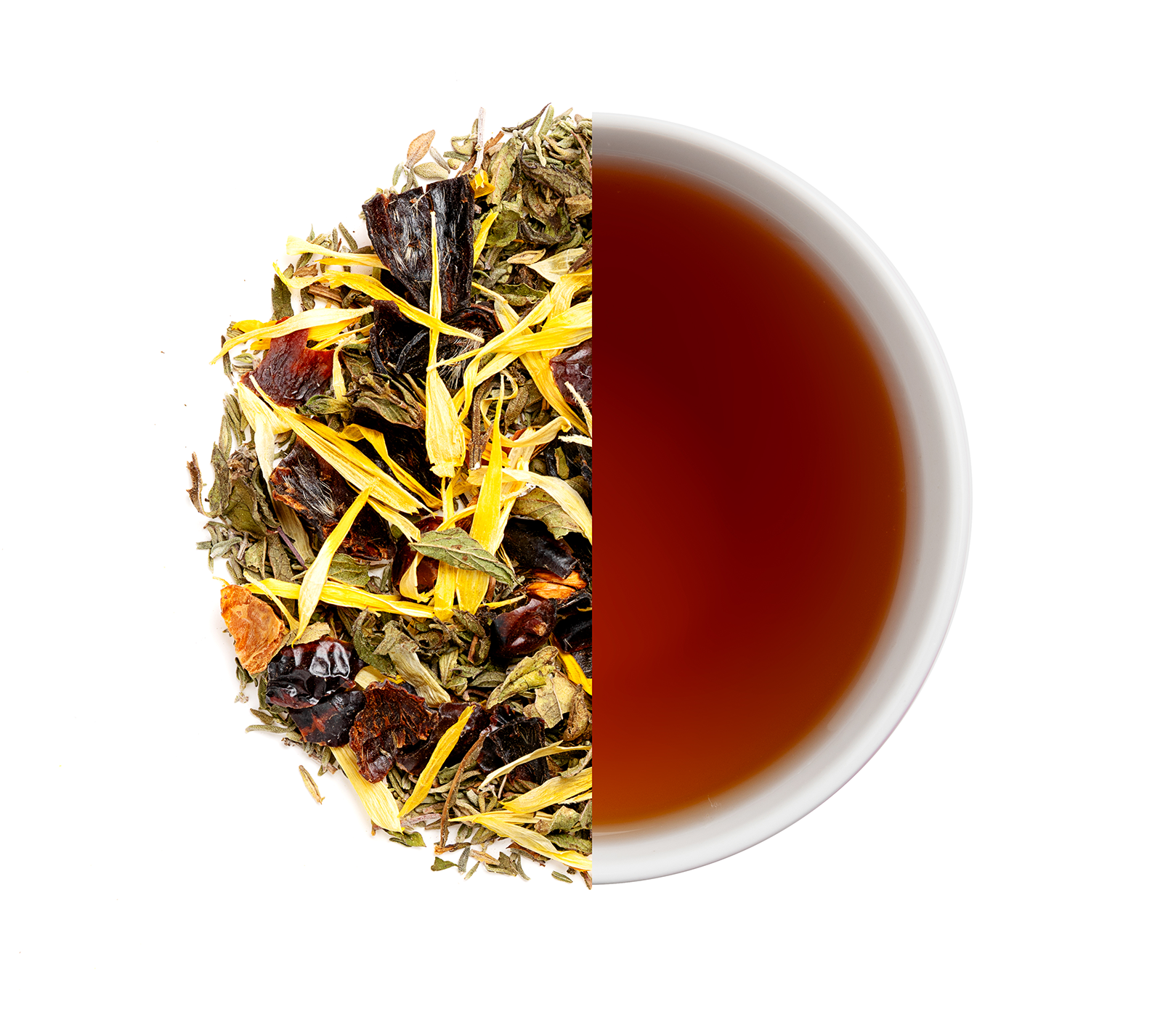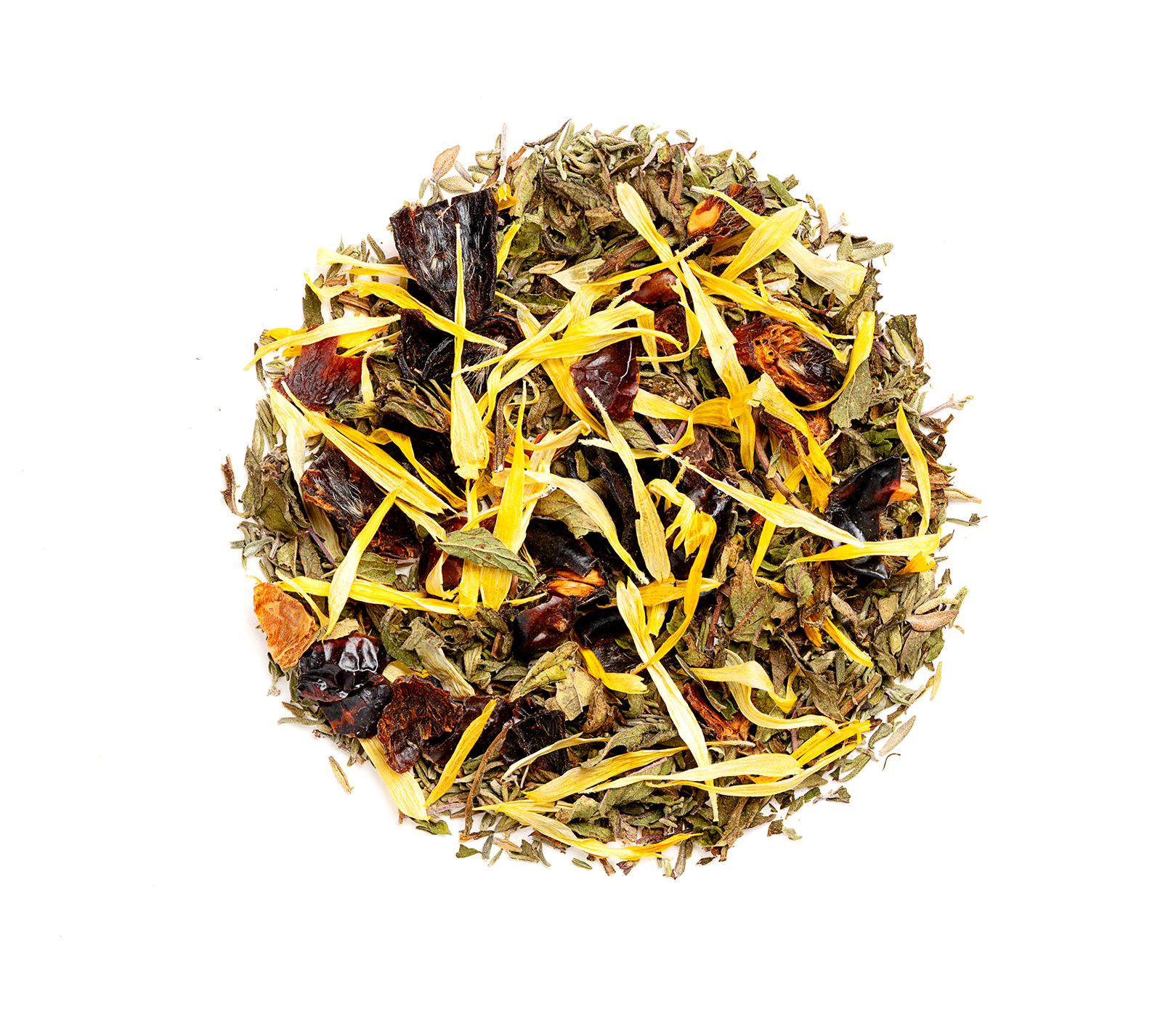 Καρπός αγριοτριανταφυλλιάς, μελισσόχορτο, άνθη καλέντουλας και θυμάρι.