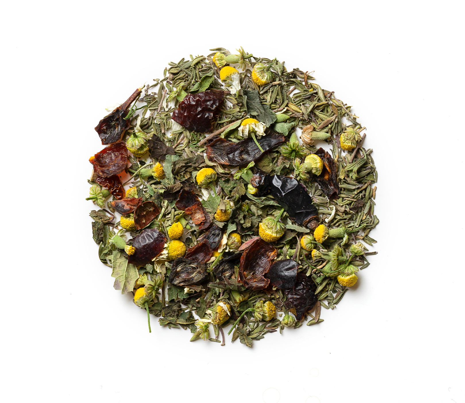 Αποξηραμένοι καρποί αγριοτριανταφυλλιάς, θυμάρι, χαμομήλι και μελισσόχορτο.